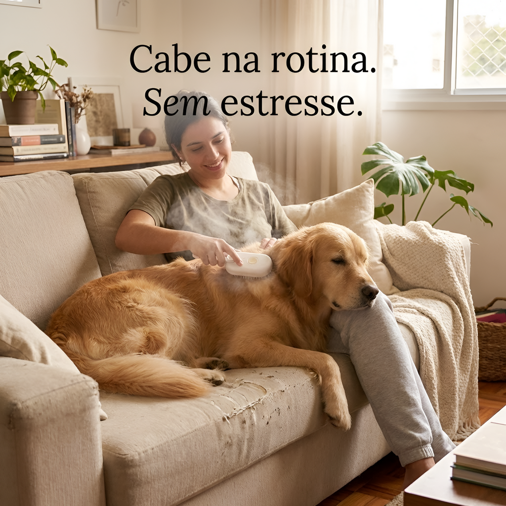 ☁️ Vapor suave durante a escovação Ajuda a “abrir” o pelo, reduz a sensação de puxão no subpelo e melhora o conforto no contato.