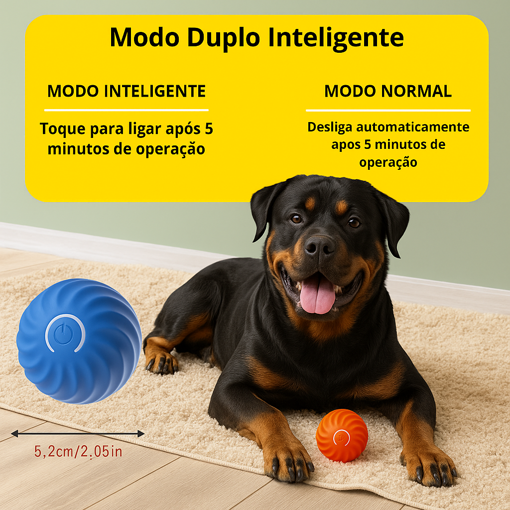A Bolinha Interativa foi pensada para rolar com fluidez e promover perseguição. O formato com leve aderência incentiva o cão a empurrar com o focinho e as patas, aumentando o tempo de brincadeira. Use em sessões de 10 a 20 minutos, 1 a 3 vezes ao dia.